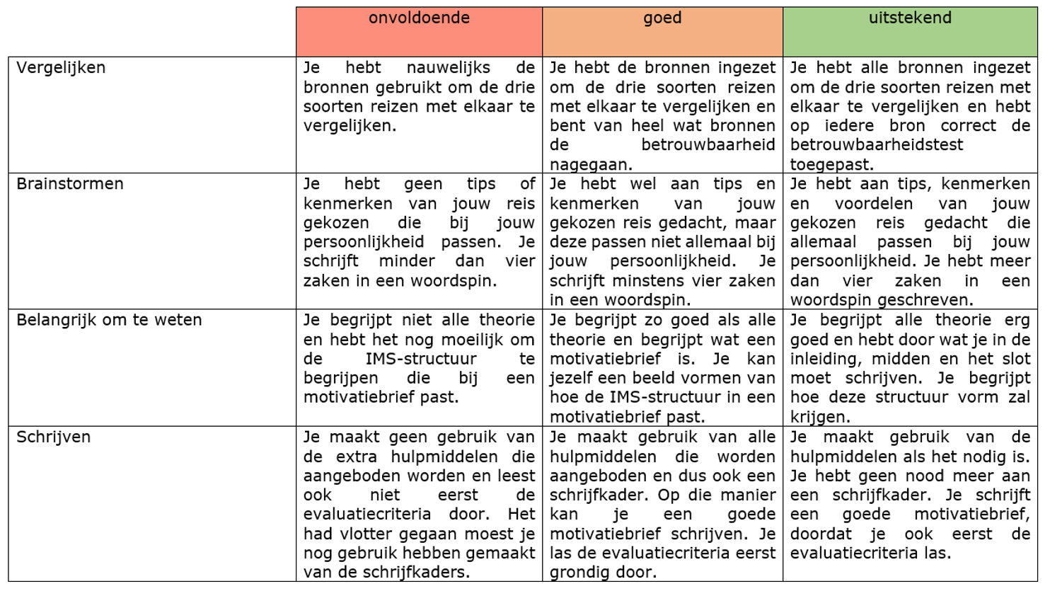 Binnenkort kan je op reis! Jouw motivatiebrief is ingediend. Het is de eerste keer dat jullie er een schreven, dus is het normaal dat niet alles perfect liep. Omdat je altijd kan leren uit je fouten, is het belangrijk om nu even stil te staan bij hoe het ging. Dit gaan jullie doen door onderstaande tabel te bestuderen. Lees de verschillende tekstjes en evalueer jezelf door uit te maken welk tekstje het best bij jou past.